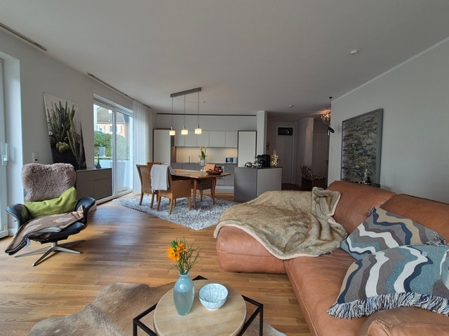 Die großzügige Aufteilung und die helle Südausrichtung des offenen Wohn-Eßbereiches bieten hohen Wohnkomfort. Der umlaufende Balkon ist durch große Markisen beschattet.