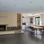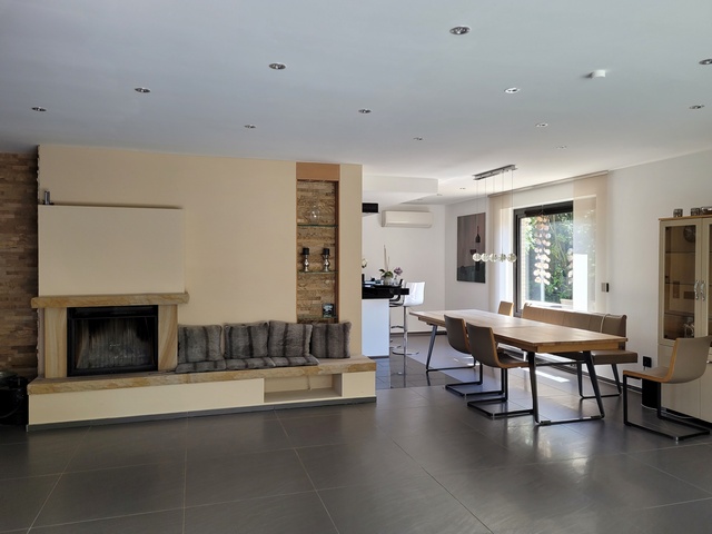 Der offene, lichtdurchflutete Wohn- Essbereich ist verbunden mit der exklusiven offenen Küche und dem großen Kamin in modernem Design.