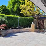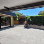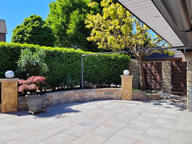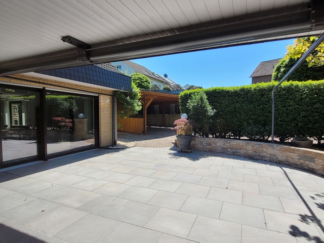 Die großzügige Terrasse ist zum Teil überdacht und kann durch ein zusätzliches Markisensystem vollständig beschattet werden.